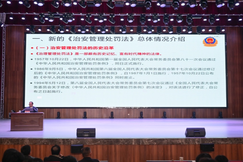 罗校长重点介绍了我国治安管理处罚法的历史沿革、立法目的、适用范围、新法核心变化与主要亮点、条文要义、学习宣传贯彻等内容,聚焦社会治理热点和青少年成长、学生工作、校园安全稳定等问题,以案释法,析理说法,深入浅出剖析了扰乱公共秩序、妨害公共安全、侵犯人身权利与财产权利、妨害社会管理四大类常见的治安违法行为,引导师生深化认识治安管理违法行为的危害及其处罚细则,介绍了该法与刑法、民法典、未成年人保护法、预防未成年人犯罪法、爱国主义教育法等其他法律的联系,强调法治育人,以法润心,强调自觉学习法律、终身学习法律,养成尊法、学法、守法、用法的法治思维,做合格公民,做堪当强国建设和民族复兴大任的时代新人。